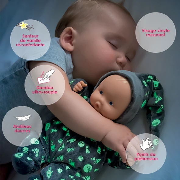 Son petit format, 25 cm, parfaitement adapté aux bébés dès la naissance, en fait un excellent cadeau de Noël à glisser sous le sapin, entre les boules scintillantes et les paquets pleins de promesses.