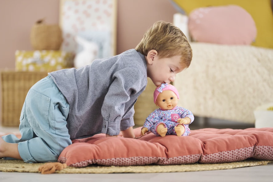 - Avec un poupon, représentation d’un bébé, votre enfant sera dans un jeu d’imitation : il va en prendre soin, reproduire sur lui les gestes que vous faites sur lui au quotidien.