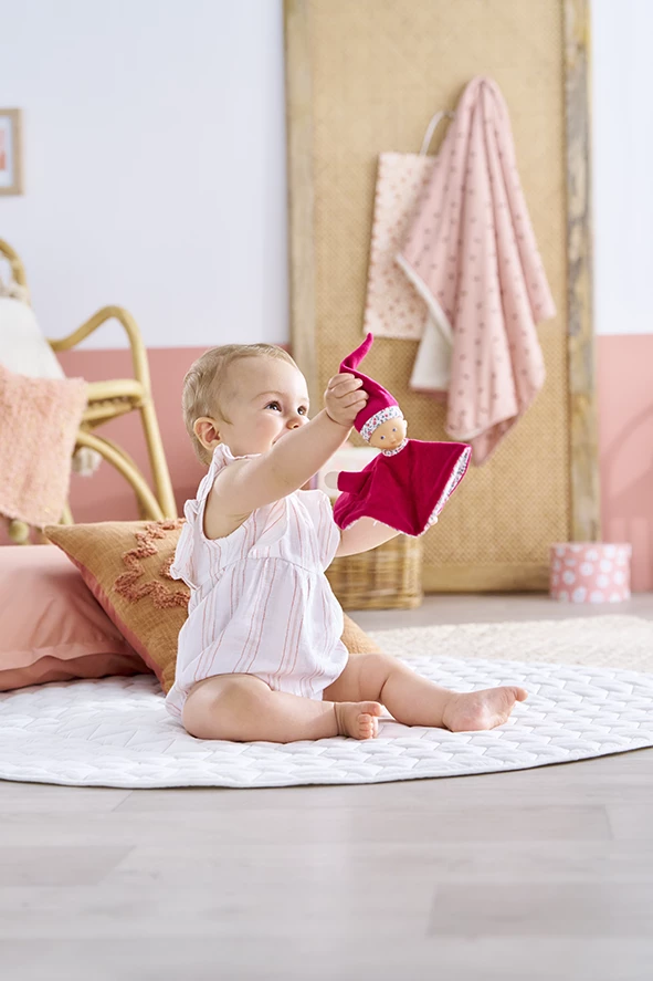 Quelques mois avant son premier anniversaire, votre enfant commence à comprendre, à exprimer et à gérer ses émotions. Votre bébé apprend peu à peu à développer ses habiletés à communiquer avec les autres. Pour l’encourager dans cette voie, offrez-lui son premier poupon. Le poupon Pti’cœur est un petit poupon de 30cm parfaitement adaptée aux petits bras et mains de l'enfant. Son corps souple est léger et facile à saisir, et son vinyle doux est des plus agréables au toucher.