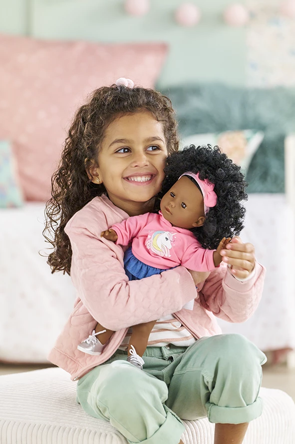 Poupée habillée de 36 cm. Corps souple "effet" sous-vêtements. Poupée avec des cheveux soyeux à coiffer. Yeux dormeurs. Senteur de vanille. Dès 3 ans.